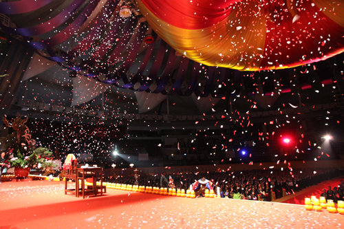 縣長吳志揚致詞時先感謝心道法師的慈悲,已是第18年來在桃園舉辦水陸法會,啟建一處清淨道場,一直以來庇佑著大桃園境內居民,更發揚「普施」精神,持續以善心勸募許多愛心物資,贈與大桃園地區有需要的團體與家庭。同樣的,桃園地區也從2011年8月推動「愛與祥和公益聯盟」,一年多來集結民間慈善社團的力量,配合社會福利措施推行,共同落實愛與祥和的社會,讓愛與祥和的幸福桃花源得以實現。」這也是響應心道法師的悲智願行,落實「悲願 嚴謹 平等」的水陸精神,讓更多人合心協力實踐人間善行,以互助互愛之精神,讓社會充滿祥和瑞氣。